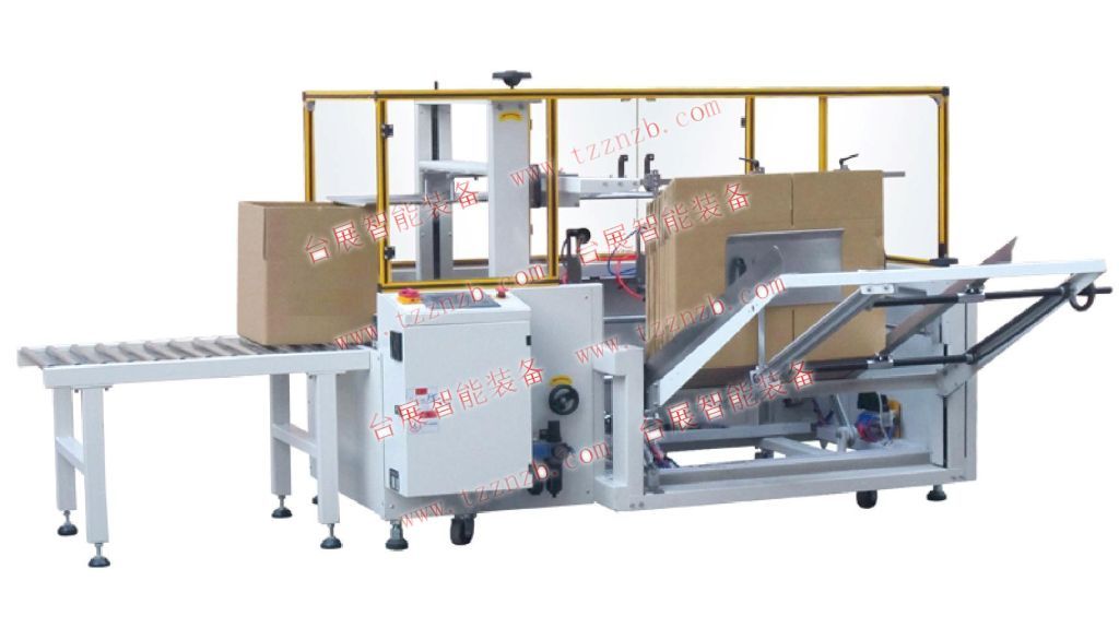 自動完成開箱、成形、下底折葉折曲.并實時完成下部分膠帶粘貼,將疊成紙板的箱板自動打開,箱子底部按一定程序折合,并用膠帶密封后輸送給裝箱機(jī)的專用設(shè)備。